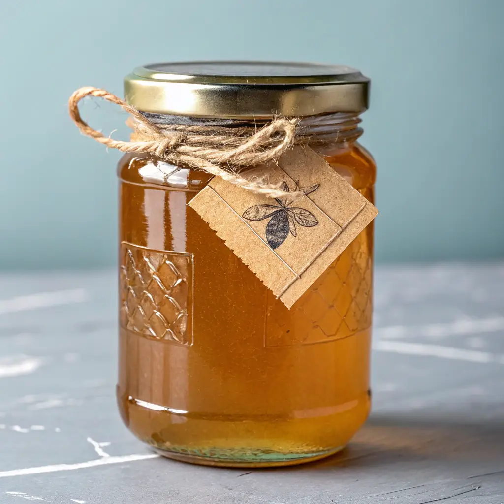 This organic strained honey is produced from organic beekeeping practices, ensuring a pure and healthy product. It is presented in a stylish glass jar with a wooden lid, emphasizing its natural and organic qualities. Suitable for health-conscious consumers who value organic certification and purity.